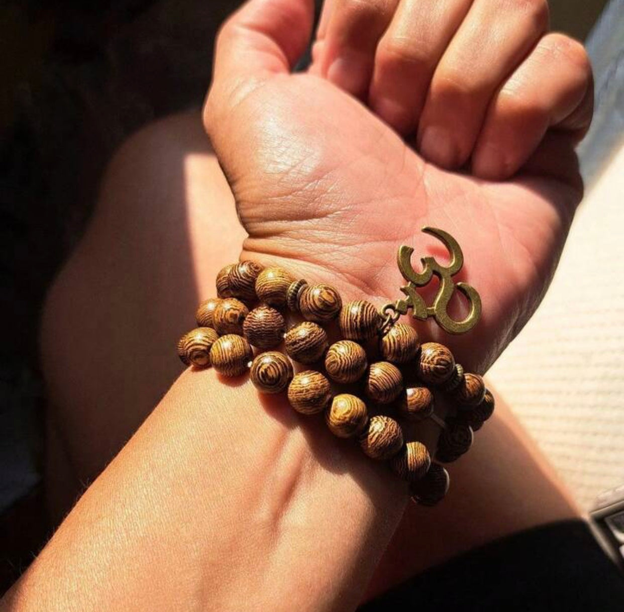 8mm Ohm, natural wood, Mala beads. Can be worn in multiple ways.
